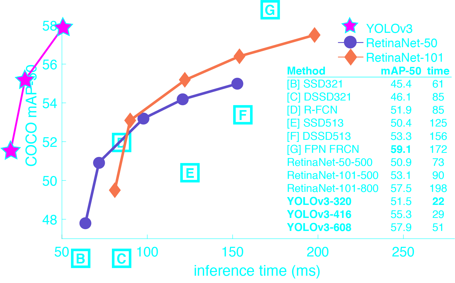 YOLOv3 is extremely fast and accurate. In mAP measured at .5 IOU YOLOv3 is on par with Focal Loss but about 4x faster. Moreover, you can easily tradeoff between speed and accuracy simply by changing the size of the model, no retraining required!