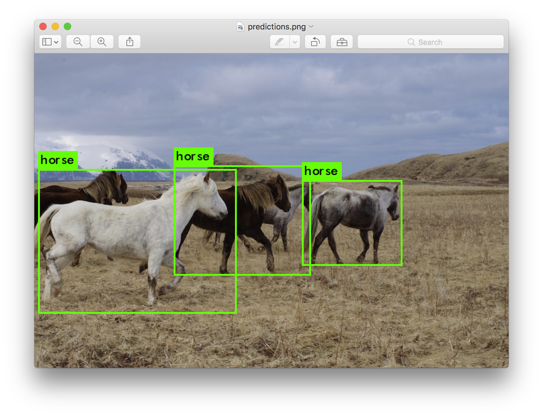 Darknet prints out the objects it detected, its confidence, and how long it took to find them. We didn’t compile Darknet with OpenCV so it can’t display the detections directly. Instead, it saves them in predictions.png. You can open it to see the detected objects. Since we are using Darknet on the CPU it takes around 6-12 seconds per image. If we use the GPU version it would be much faster.